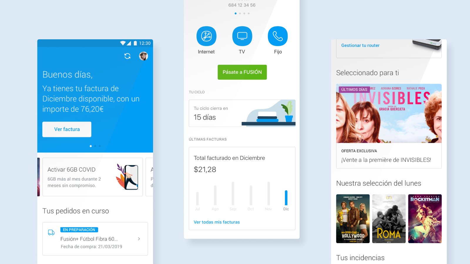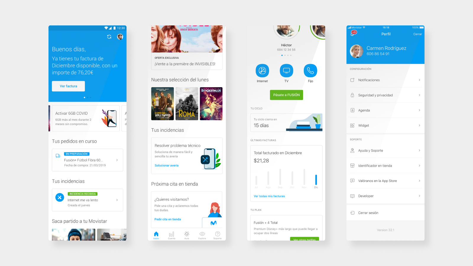 The app Mi Movistar (Android/iOS/Web) is the application used by Movistar's customers in Spain (the biggest Telco in the country). This application was customized to be leveraged by other brands of the company. From this tool, it is possible to manage all the lines and services of the paid or prepaid contracts as well as the management of the Movistar+ TV packages.