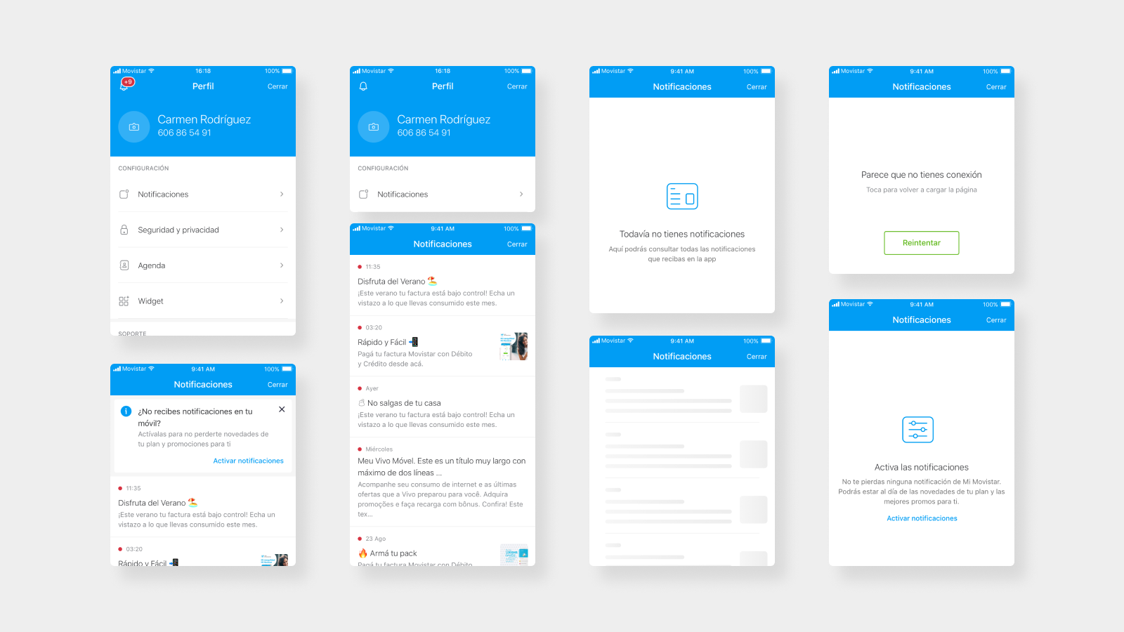 There was a need of comunication to the clients within the Mi Movistar app in an agile way and less intrusive as possible. The objective was to send short notifications, alerts, promotions or any type of relevant information to the customers. In addition, notifications are stored in the app, like for example an inbox, so customers can read later.